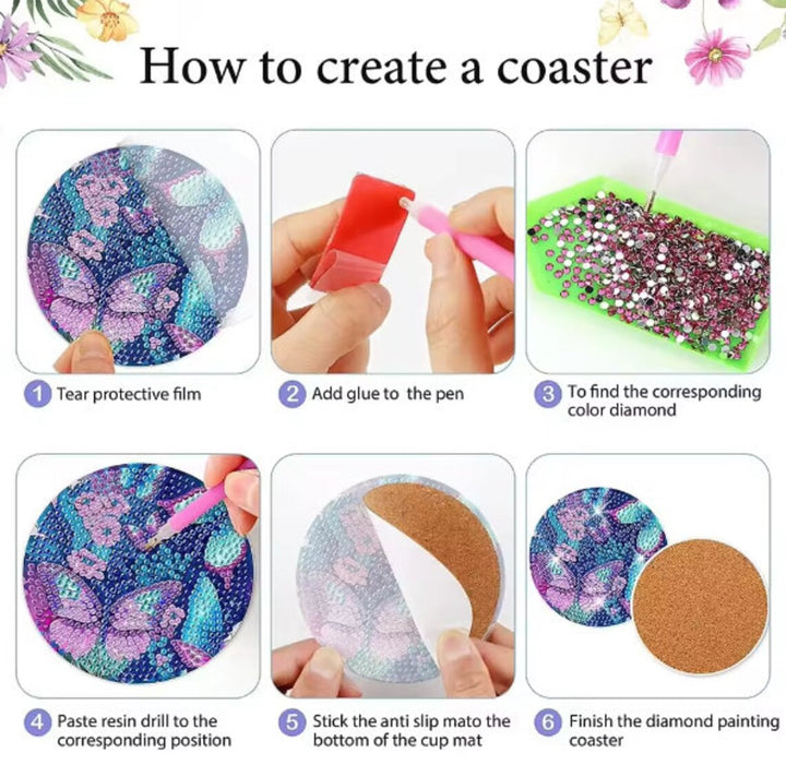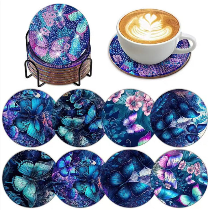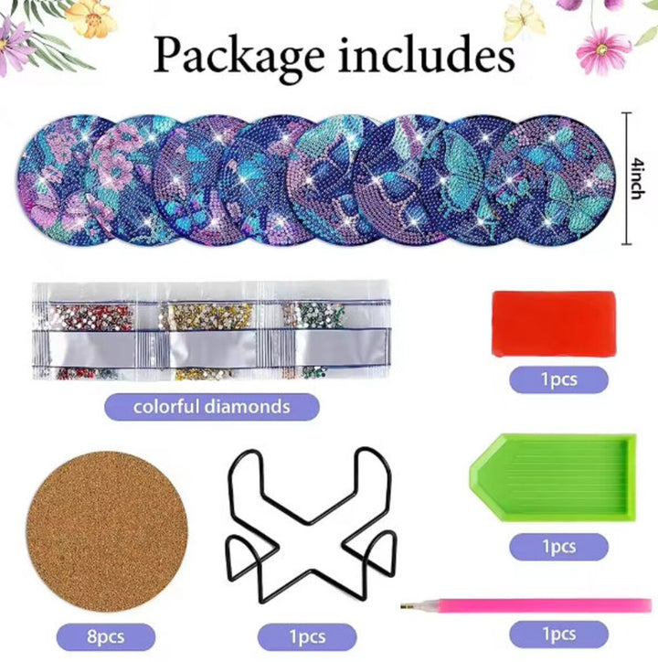 8pcs 5D Diamond Art Coasters Colourful Purple Butterfly Coasters DIY Butterfly Diamond Coasters Kit With Holder Each Pack contains 8 acrylic coasters, 8 non-slip Cork bases, 1 clay glue, 1 pen, 1 tray and a set of rhinestones. The cork base is non-slip to protect...