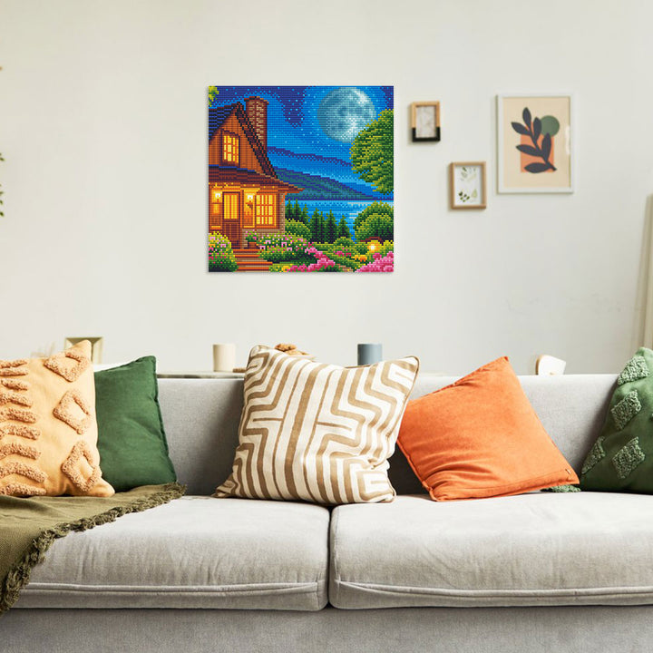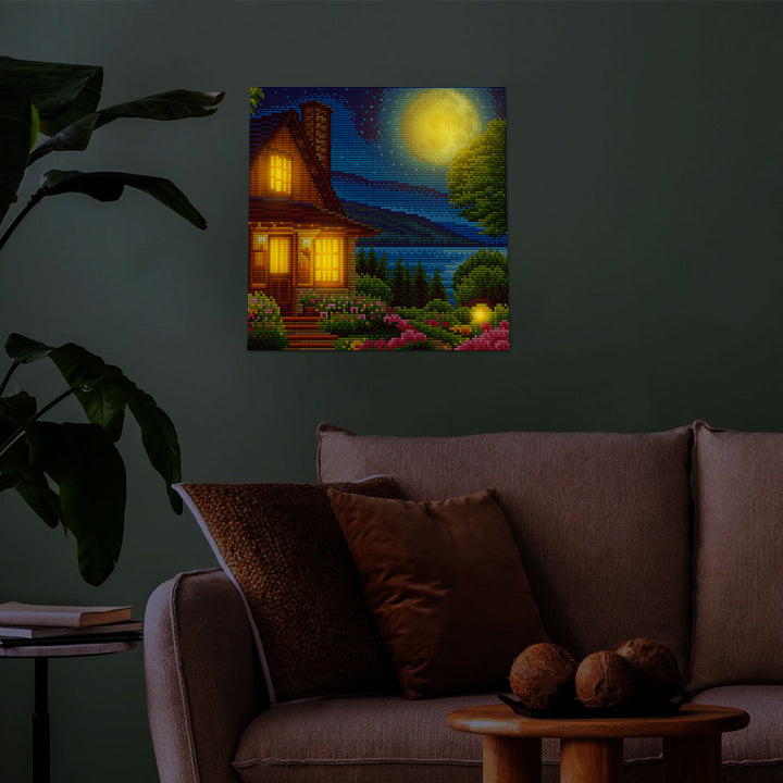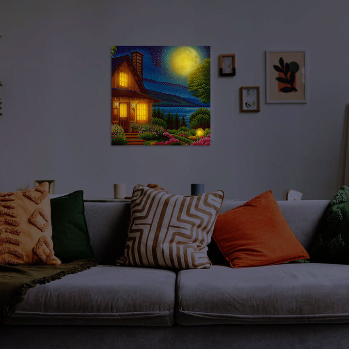 Bring warmth and magic into your home décor with this stunning DIY Diamond Crystal Embroidery Painting Kit. Featuring a cozy lakeside house illuminated under the glowing moonlight, this artwork sparkles both day and night. The built-in LED light-up effect enhances the scene, creating a radiant atmosphere that makes your finished piece truly come alive.